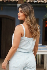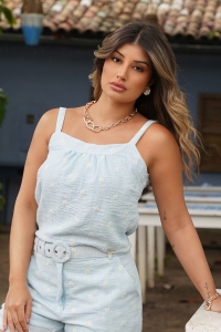 Regata/Cropped forrado, 100% poliéster com bordados de margaridas e zíper lateral.