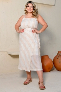 Viscose, linho, algodão e poliéster forrado. Detalhe de amarração frontal, zíper, botão e fenda na parte posterior.