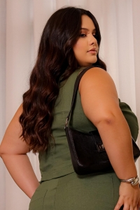 Viscose, linho e elastano. Barra frontal com recorte de bico, gola V e botões frontais para abertura e fechamento.