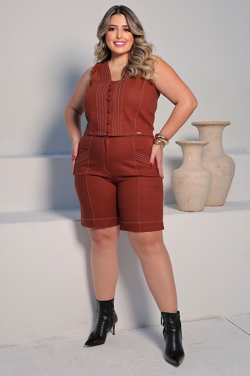Viscose, linho, elastano e poliéster forrado. Bolsos posteriores e frontais com detalhes pespontados.