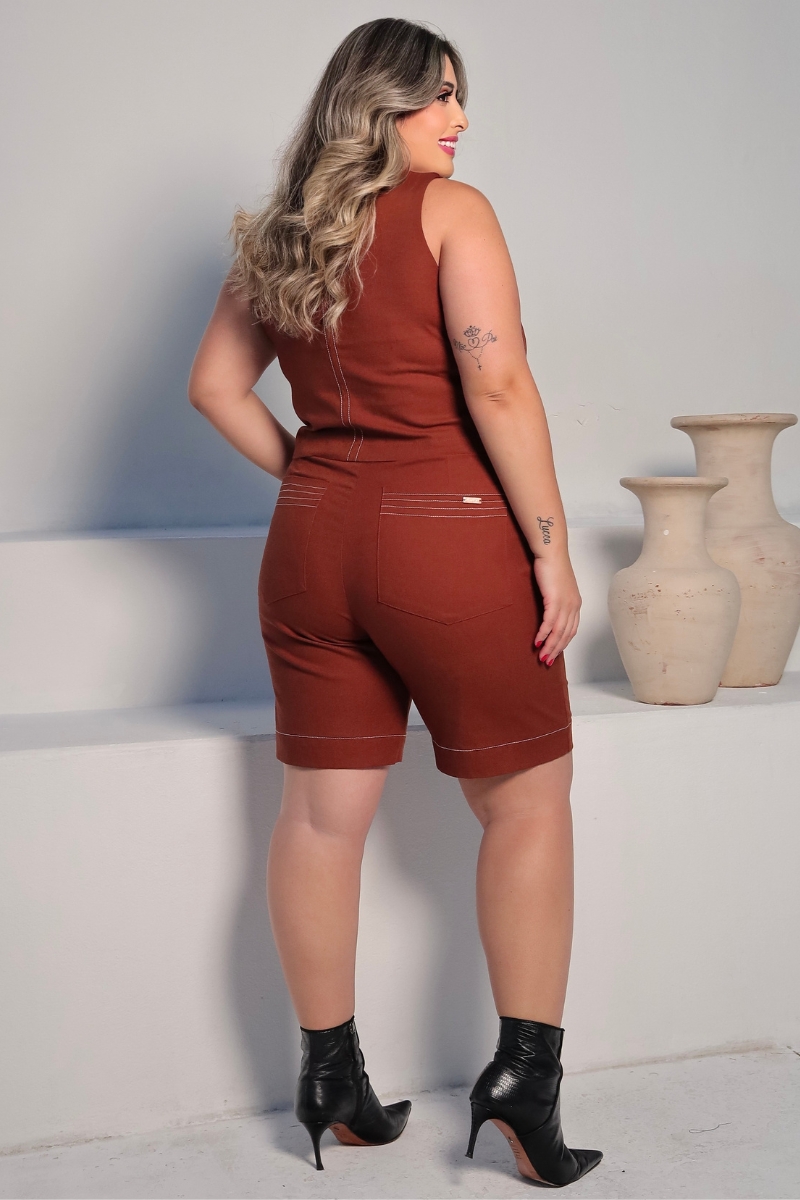 Top em viscose, linho e elastano. Gola V com botões forrados e detalhes pespontados frontais. Shorts em viscose, linho, elastano e poliéster forrado. Bolsos posteriores e frontais com detalhes pespontados.