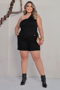 Blazer em linho, viscose e elastano. Ombro único com lapela lateral, detalhe de botão forrado frontal e zíper posterior. Shorts em linho, viscose, elastano e poliéster forrado. Bolsos frontais e posteriores acompanha cinto forrado com detalhes dourados.