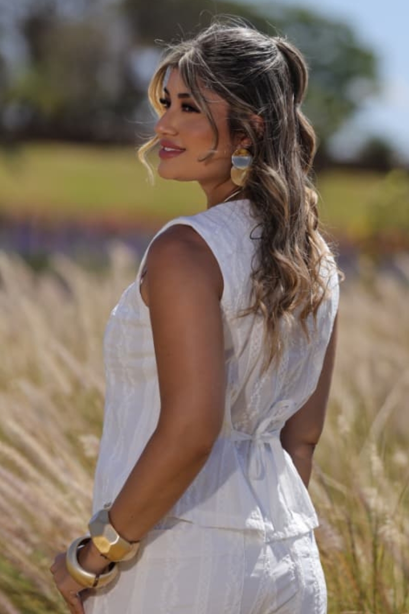 Blusa confeccionada em 100% algodão bordado que esbanja delicadeza e versatilidade. O destaque está no detalhe posterior com amarração, que permite ajustar a peça ao corpo e os botões frontais, valorizando o caimento de forma elegante e confortável. Ideal para compor produções leves e sofisticadas.
