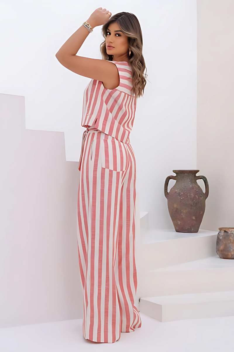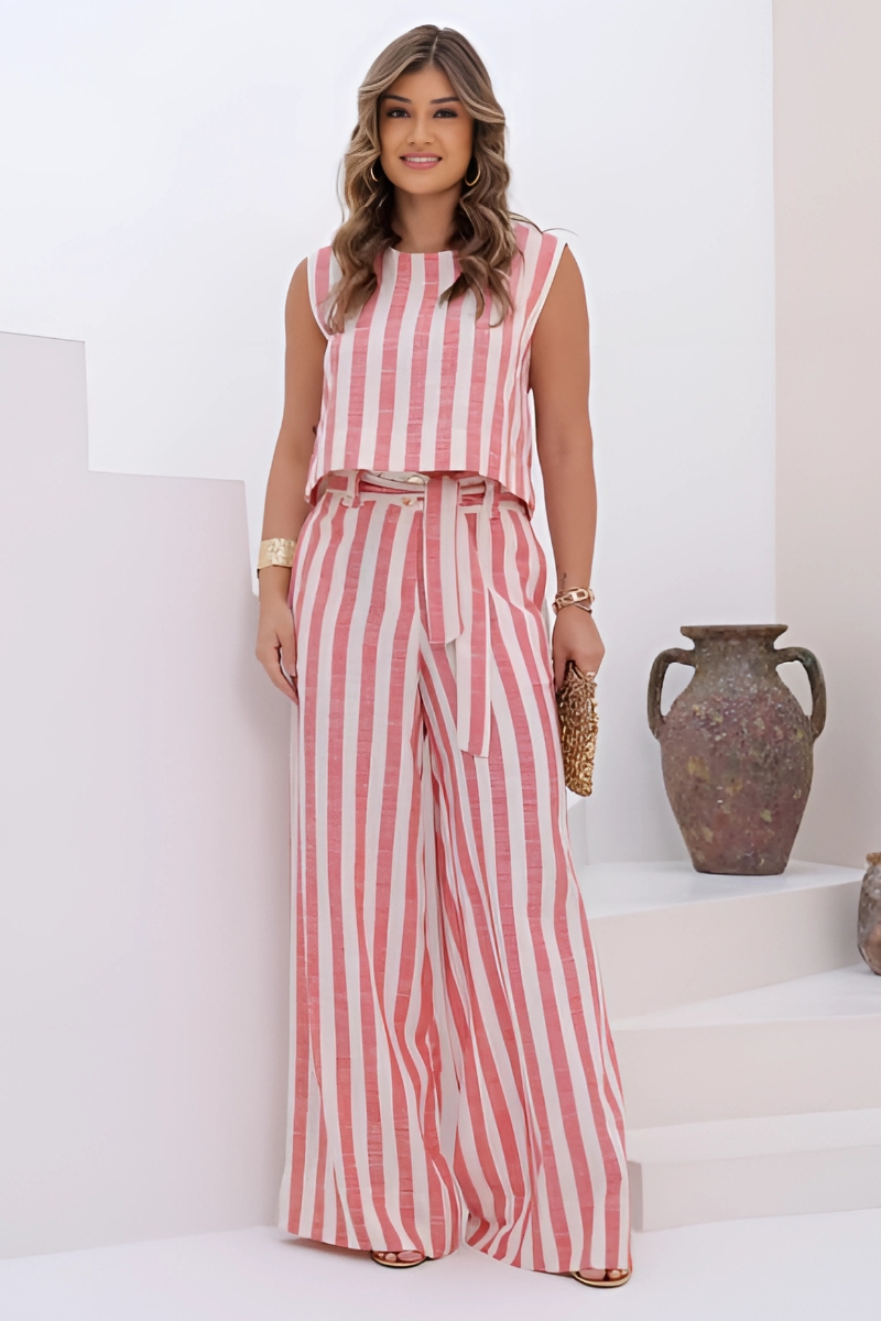 Regata em poliéster, viscose, linho e algodão. Gola redonda , pequeno detalhe de fenda nas laterais. Calça Pantalona em viscose, linho, algodão e poliéster forrado. Bolso nas laterais e posterior, botões dourados com resina branca e faixa.