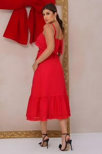 Vestido Midi. Viscose, poliéster, linho e algodão. Forrado, detalhes em Renda no busto e no barrado, zíper posterior, Elastex nas alças, bolsos dos dois lados e faixa.