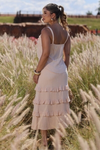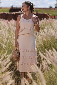 A saia midi segue a mesma proposta, com camadas de babados aplicados, criando um visual romântico e elegante. Para maior conforto e segurança, conta com forro interno em poliéster e zíper posterior, que proporciona praticidade e melhor ajuste ao corpo.