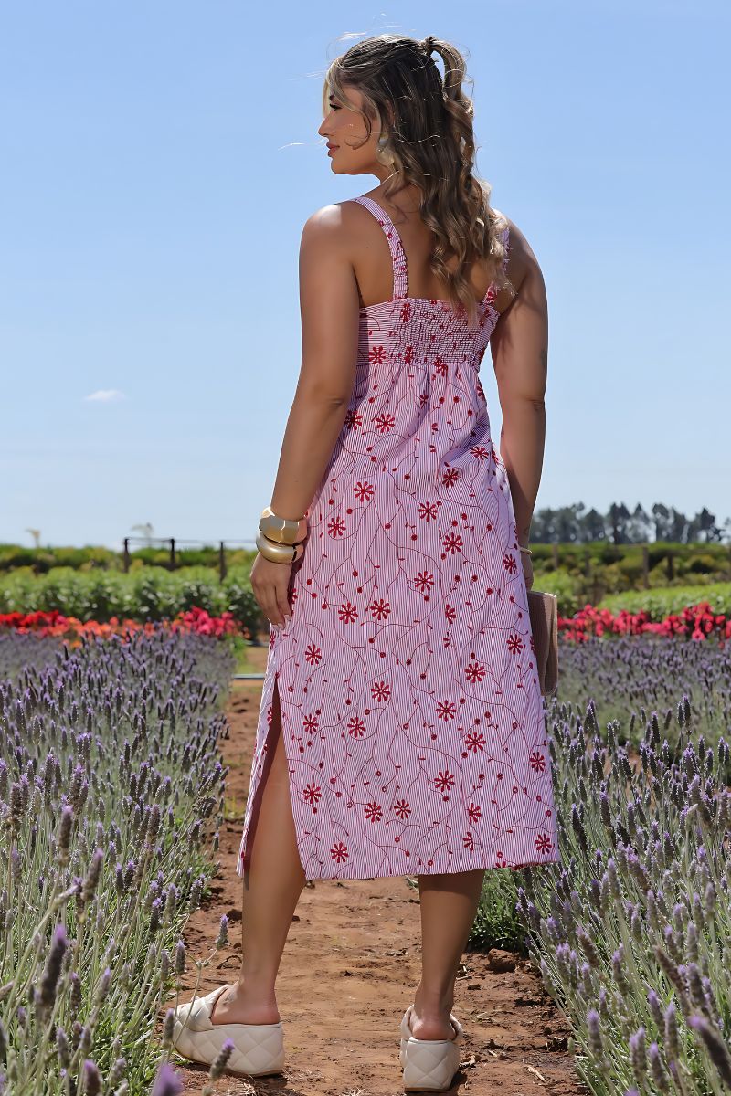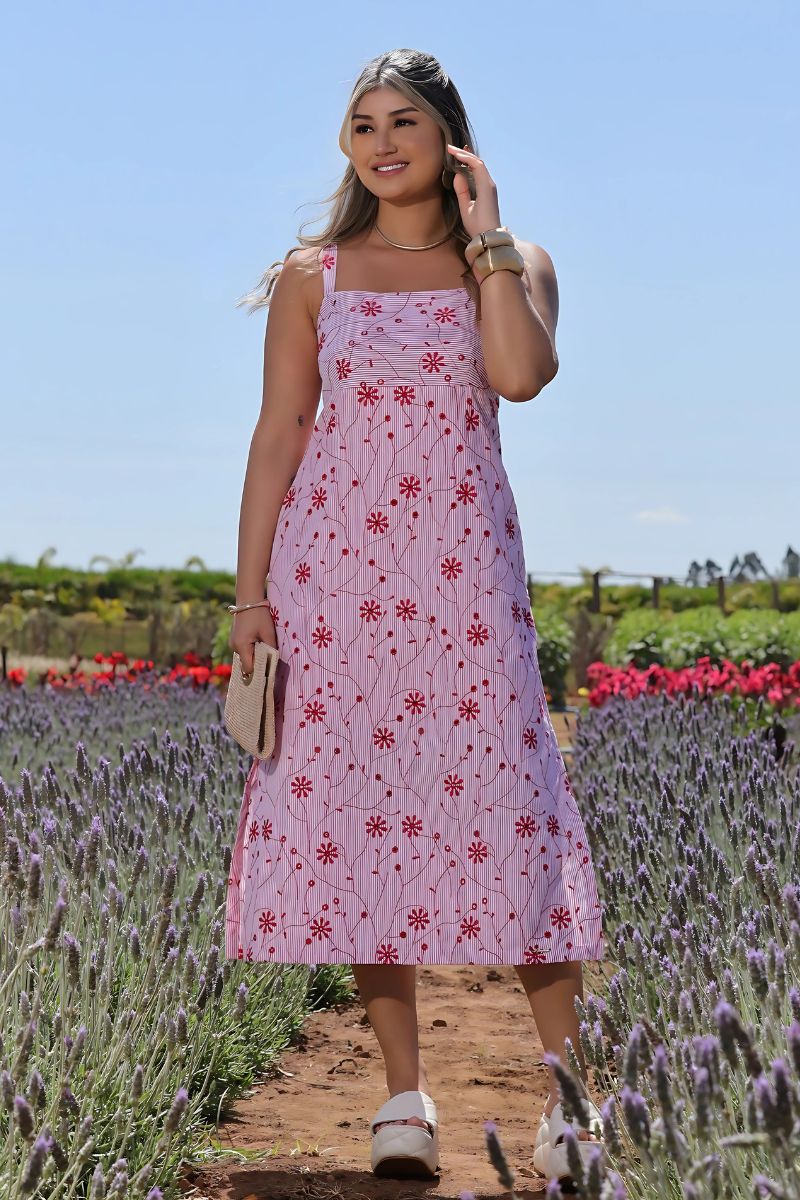 Vestido Midi. Algodão e poliéster bordado, forrado, detalhes de zíper, bolsos e fendas laterais, Elastex posterior e nas alças.